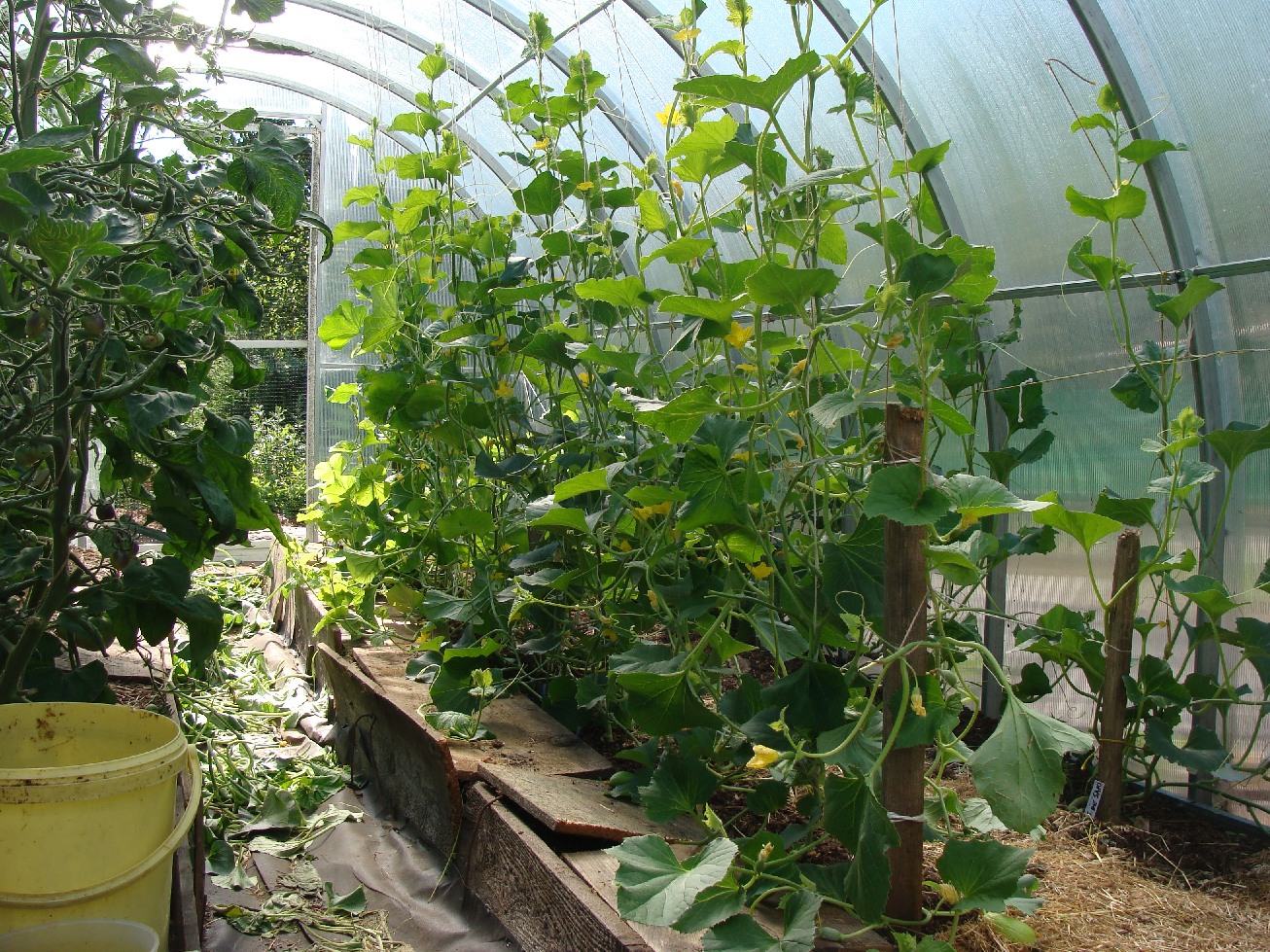 Szósta rano, sterczę w Świątyni Pomidora, pokrzywiona jak nadmorska sosna, próbując rozwiązać węzeł gordyjski, jaki w ciągu kilku dni zdążyły utworzyć pędy melonów, gdy nagle słyszę nad głową „tup-tup-tup” drobnych ptasich stópek. Ptasie stópki bezskutecznie usiłują złapać przyczepność na gładkim poliwęglanie, wciąż mokrym od rosy.